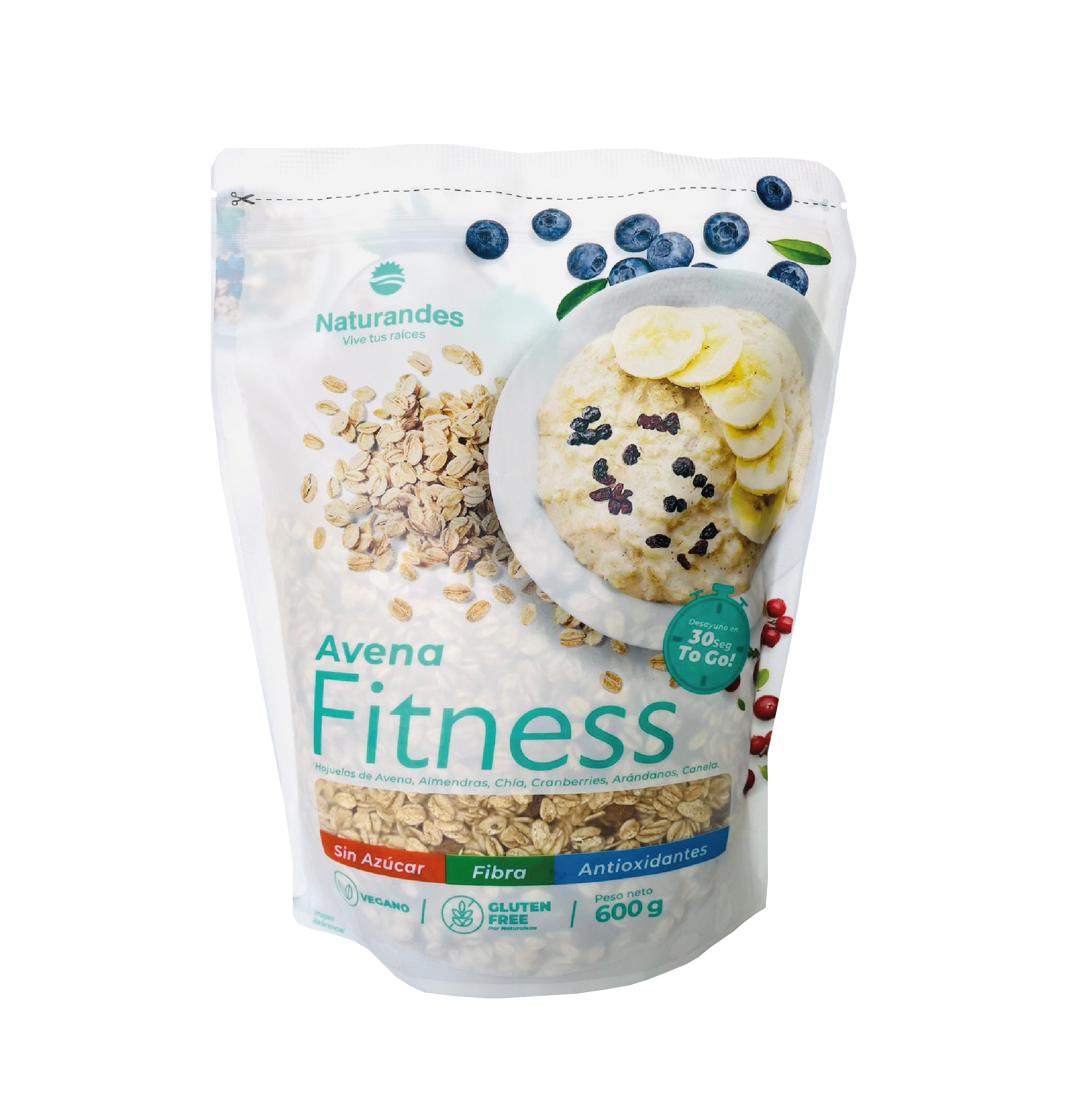 Hojuelas de Avena Fitness SIN GLUTEN, VEGANO con almendras, chia , cranberries, arandanos y canela.